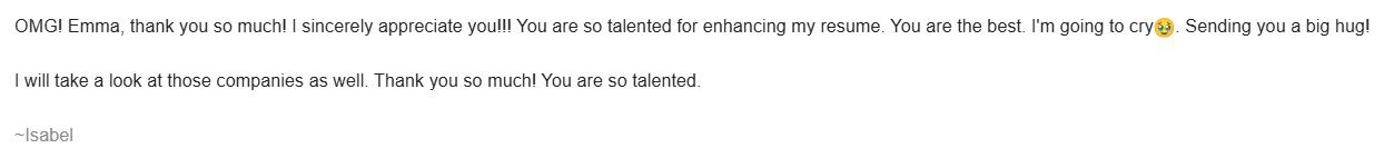 With over 4 years and 1000 of resume's edited, Emma has significant experience performing resume editing and providing career coaching for all different remote and in person non clinical careers.